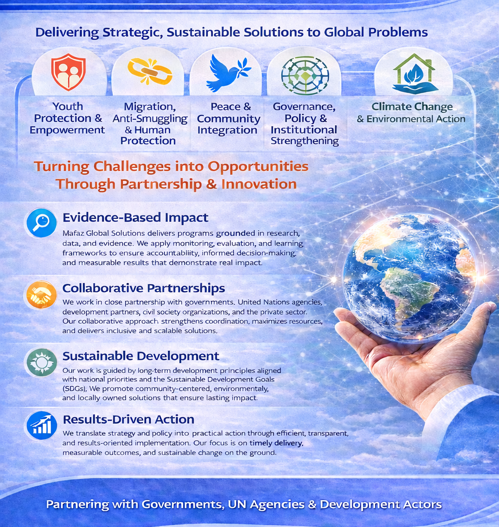 Mafaz Global Solutions (MGS) is an international solutions-oriented organization dedicated to addressing complex global challenges through innovative, evidence-based, and sustainable interventions. The organization operates at the intersection of youth protection, migration governance, security, livelihoods, policy development, and regional cooperation, with a strong focus on fragile and high-risk regions. Mafaz Global Solutions was established to move beyond fragmented responses and deliver integrated solutions that address root causes, strengthen systems, and generate long-term impact at local, national, and regional levels.