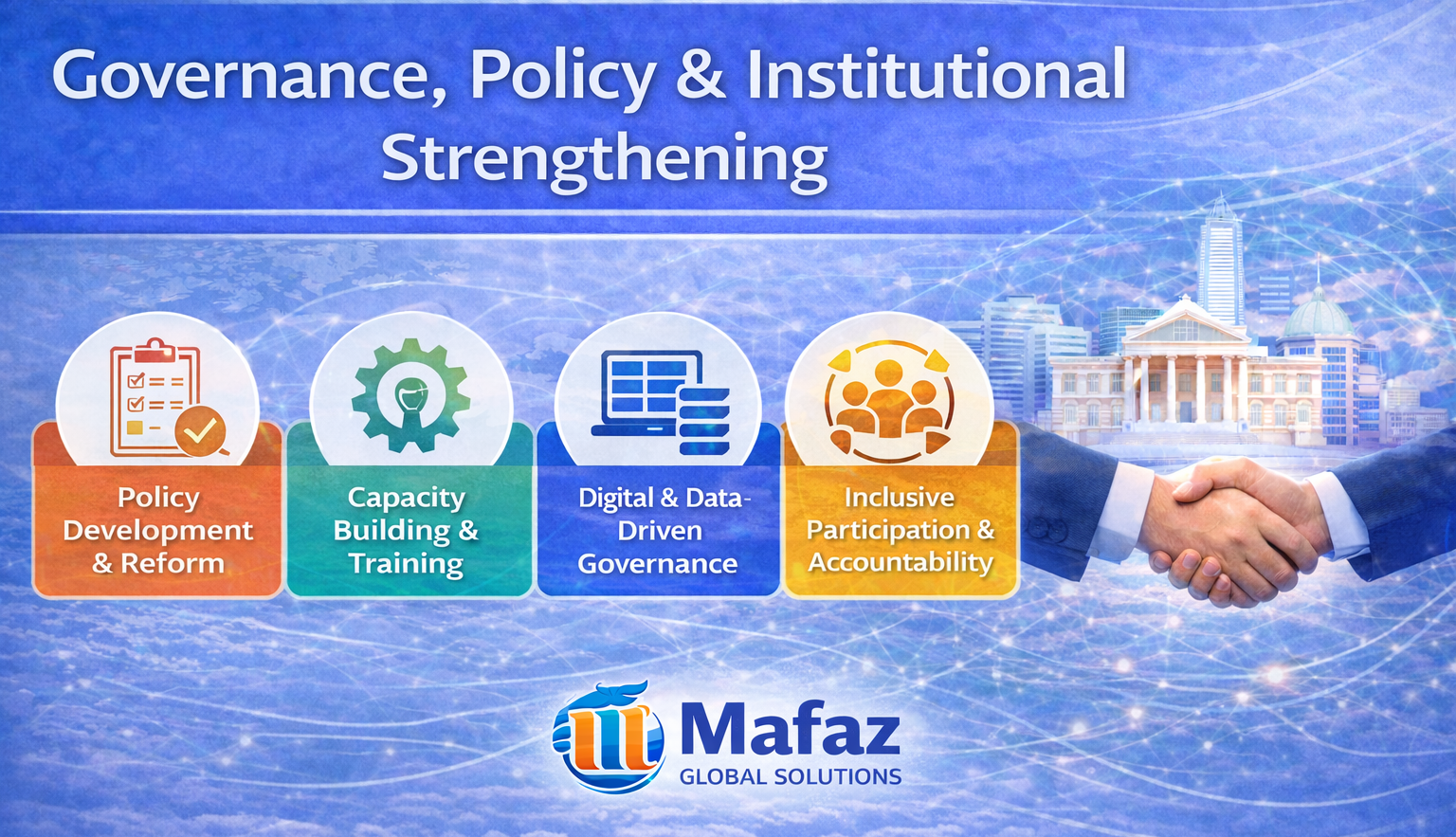 Strong governance and effective institutions are essential for sustainable development, social stability, and inclusive economic growth. Governance, Policy & Institutional Strengthening focuses on helping governments, public institutions, and partner organizations build systems that are transparent, accountable, and responsive to the needs of people. By improving how policies are designed, implemented, and evaluated, this focus area contributes to long-term resilience and better public service delivery.