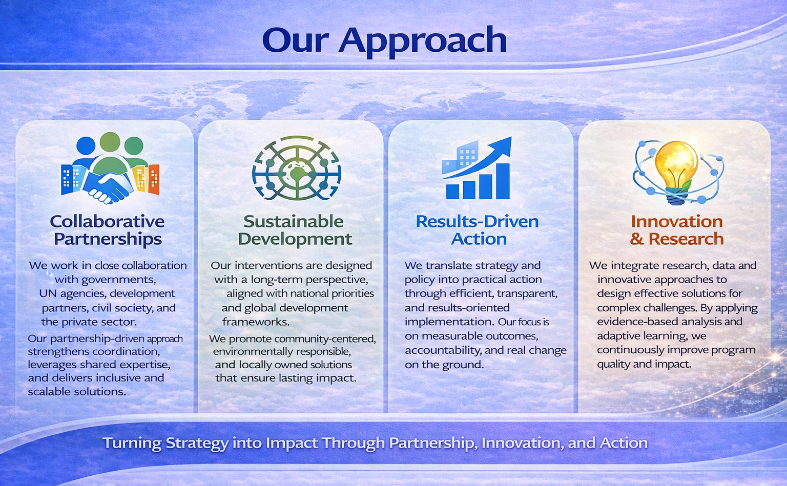 Our work is guided by four core pillars: Collaborative Partnerships, Sustainable Development, Results-Driven Action, and Innovation & Research. Together, these pillars define how we design, implement, and deliver solutions that respond effectively to real-world challenges while strengthening institutions, empowering communities, and supporting long-term development.